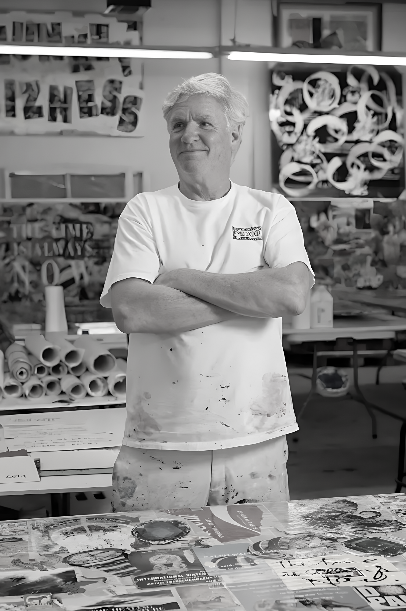 A contemporary American artist renowned for his bold, text-driven mixed-media works. His signature style features large-scale paintings and collages using acrylic paint, oil stick, vintage newsprint, dictionary pages, found objects, discarded materials, photography, and silkscreen elements. He layers these with powerful, repeated phrases that serve as affirmations or calls to action. On the 2nd floor outside the Gym entrance are two examples of Tunney’s work.