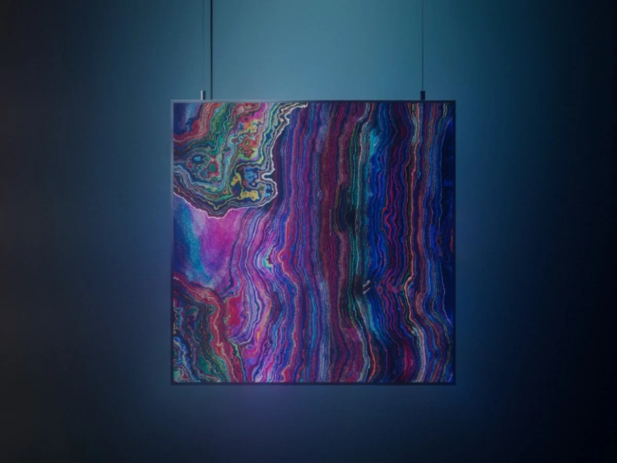 Curated by Angelo Sotira (founder of DeviantArt), this installation showcases a rotating collection of world-class contemporary digital art rendered with exceptional precision.