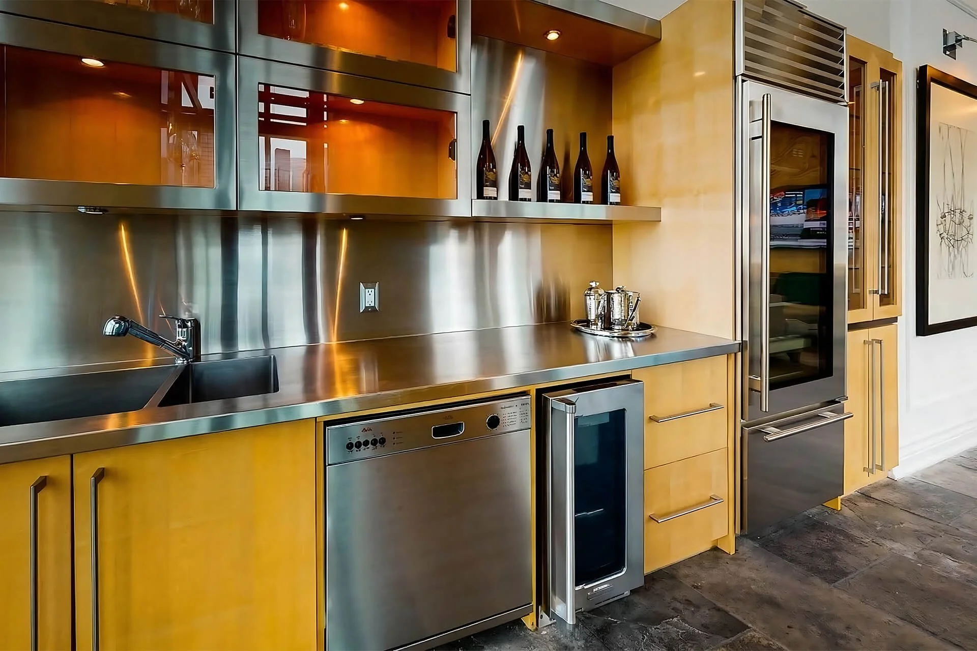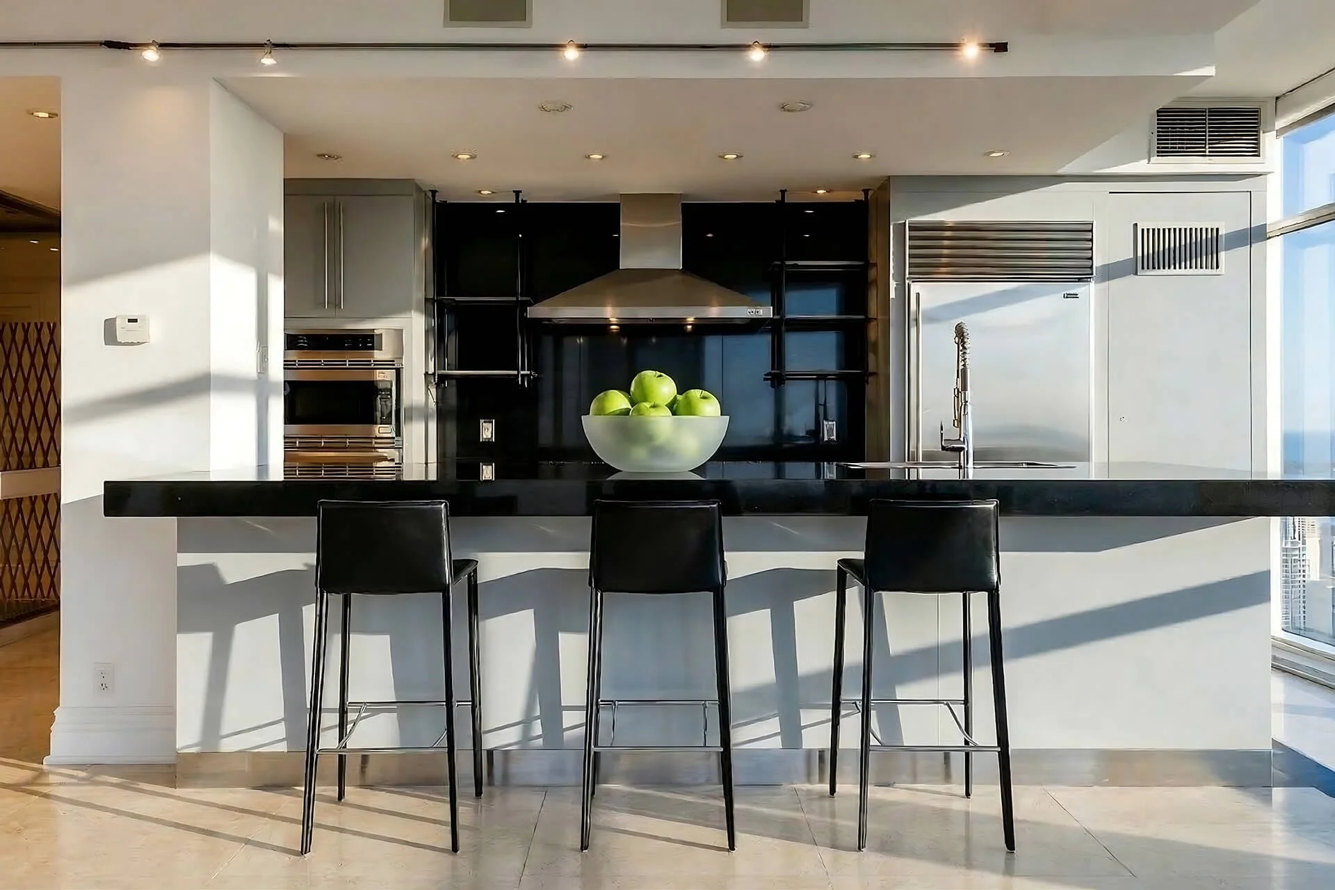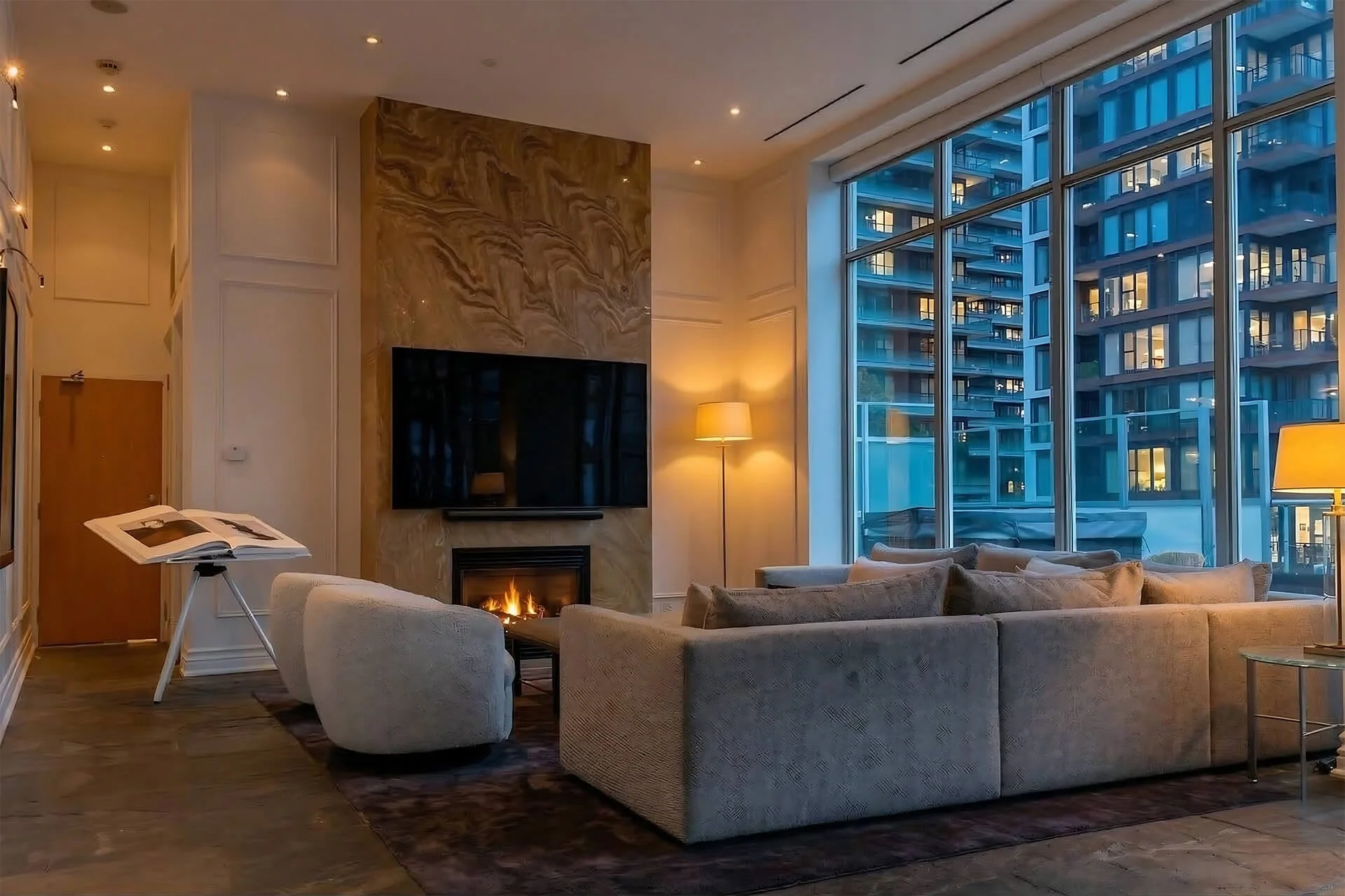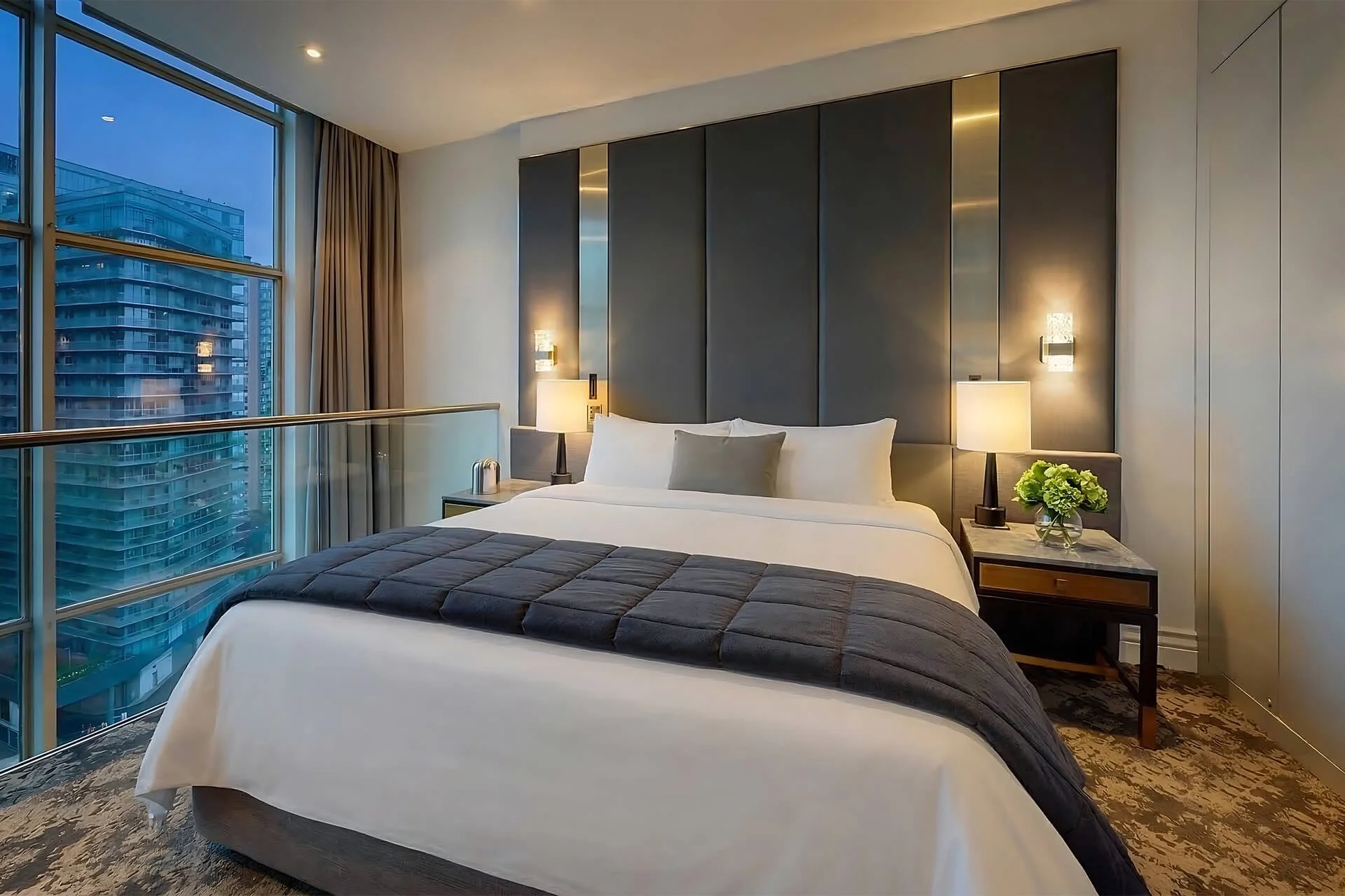 This bi-level one-bedroom loft offers a well-appointed oversized king bedroom overlooking a luxurious living room. The living area has a built-in wet bar and floor-to-ceiling windows for a true downtown Toronto experience.