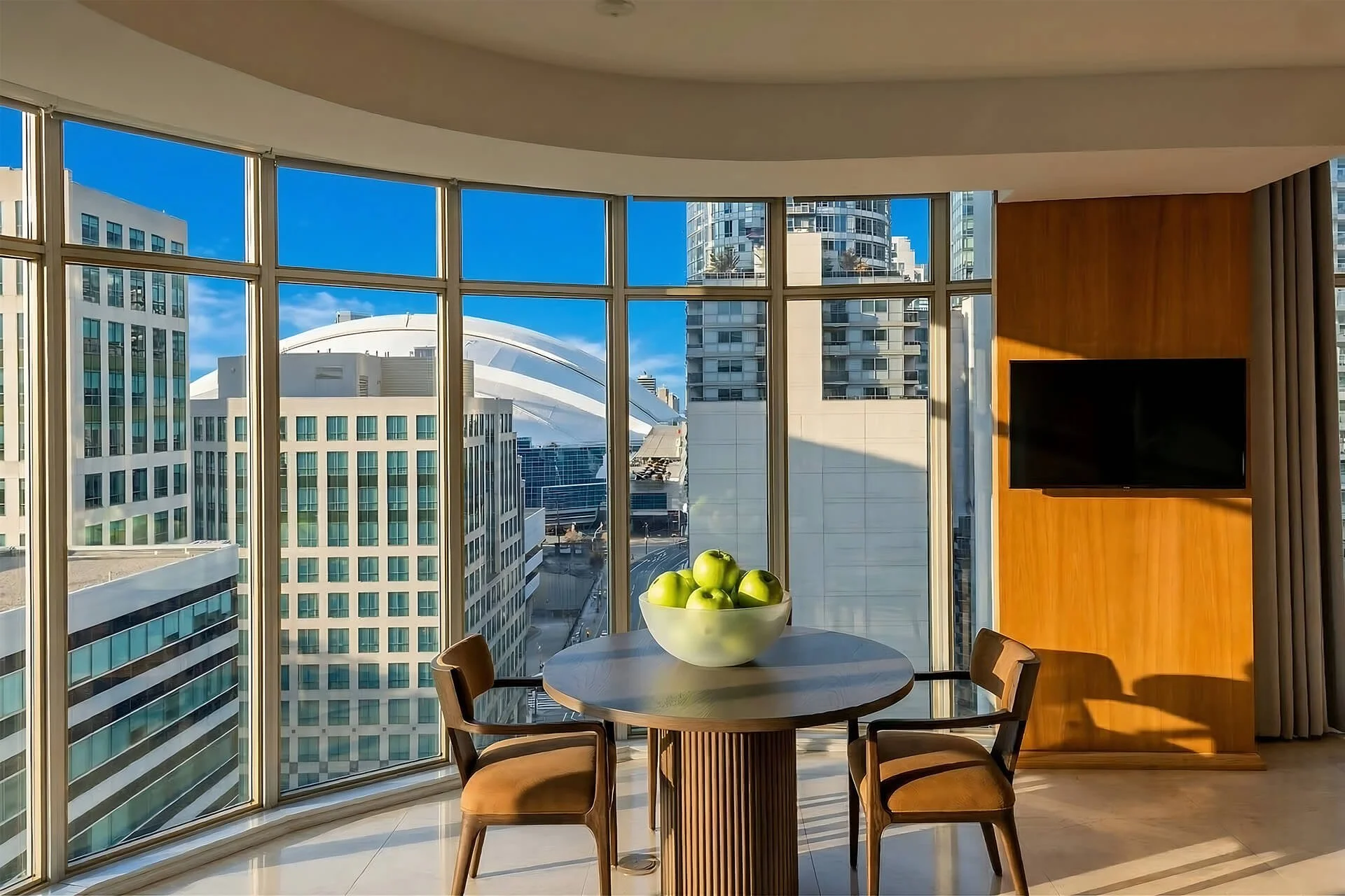 Overlooking the Rogers Centre this one-bedroom suite is bright and modernly furnished. If features a large living area, dining table for six, executive desk and a separate king bedroom.