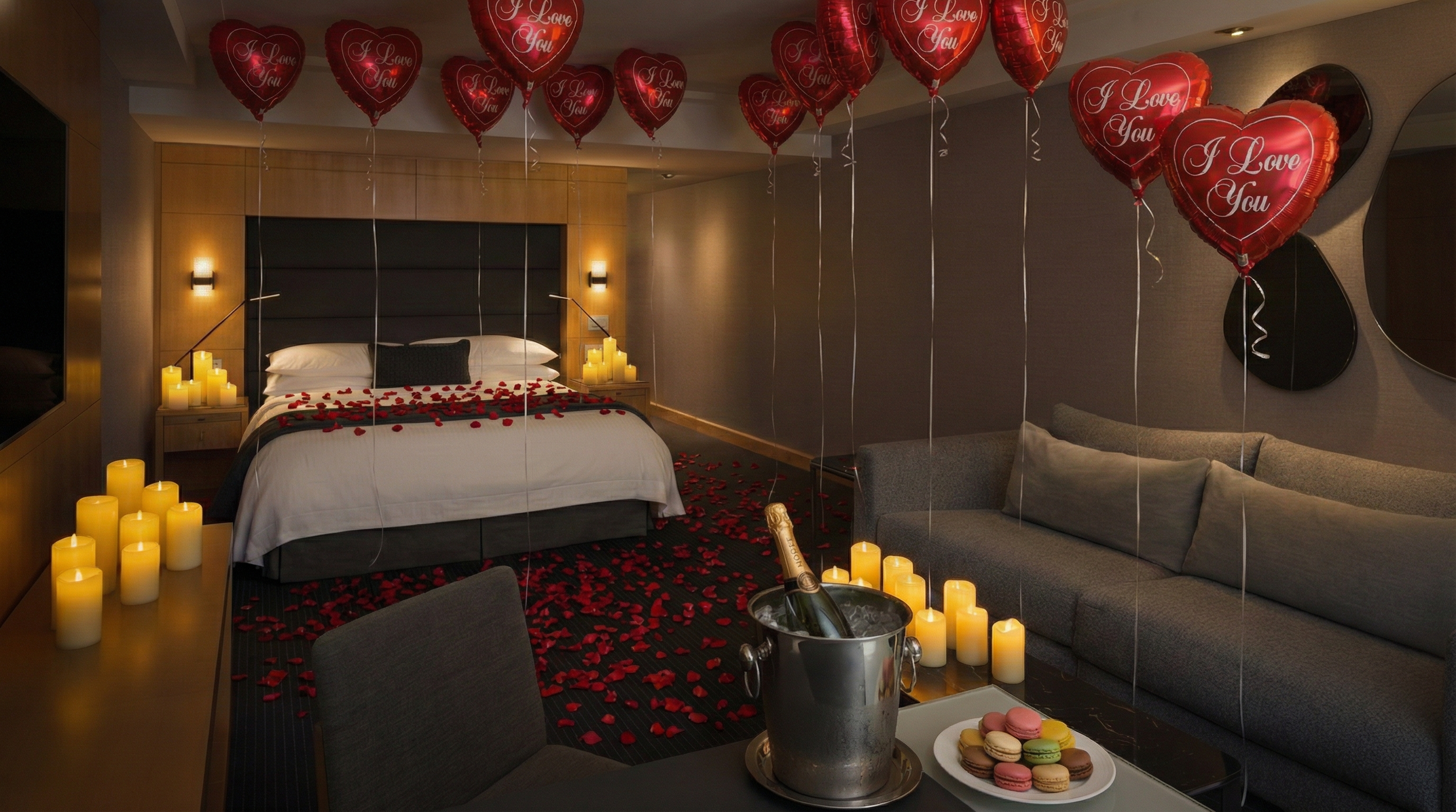 From $130 ~ Choice of bubbly, flameless candles, rose petals, bubble bath & bath salts, bite-size snacks, chocolate-covered strawberries, x12 heart shape ceiling balloons, “I love you” balloons & SoHo Concierge’s sweet treat.